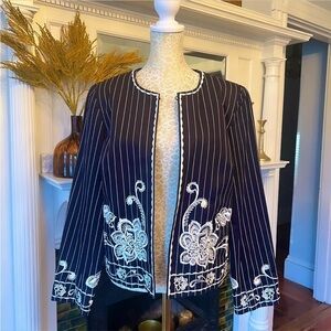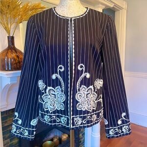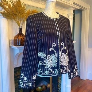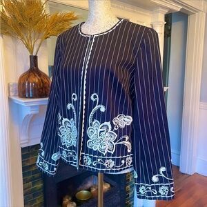 Stunning Navy & White Pinstriped Embroidered Floral Jacket / Blazer by “Oscar- An Oscar De La Renta Company” in Women’s Size 6!