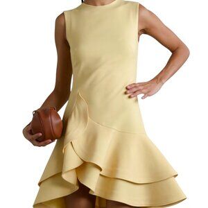 Cut from smooth crepe, it has a slim bodice that flares out to a sculptural, ruffled hem.Pastel-yellow wool-blend crepe