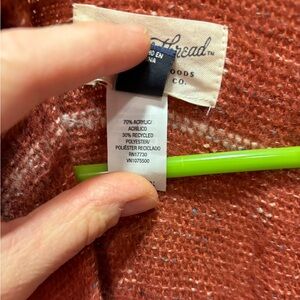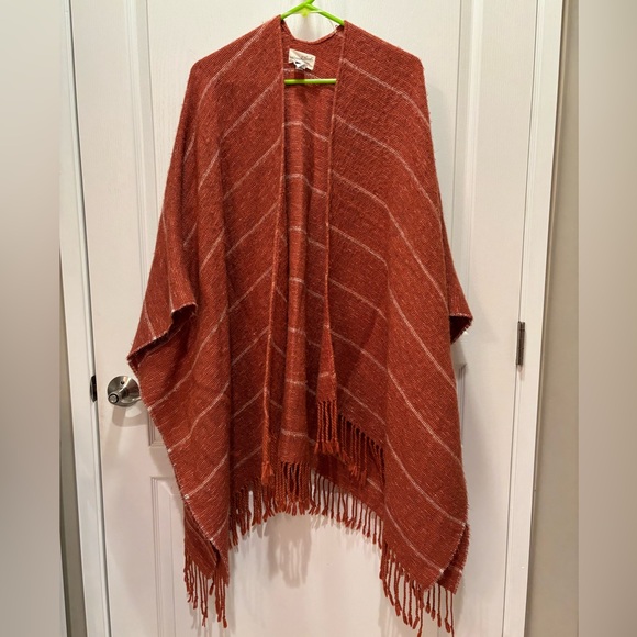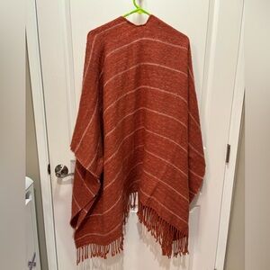 One size fits most (OSFM), rust colored shawl with cream stripes. So cozy!