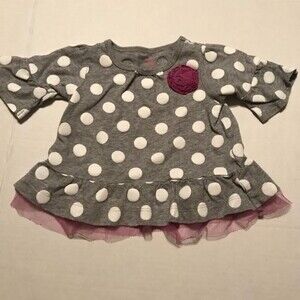 OSH KOSH CARTER’S CHILDREN’S PLACE 12 Month Tops. Purple Children’s Place onesie with stripes and ladybug. Gray polka-dot Carter’s top with purple tulle and flower. Osh Kosh Long Sleeve onesie with ruffles.