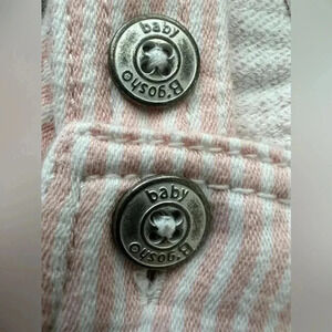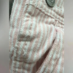 Infant girl coveralls/overalls. Classic Oshkosh cotton, pink and white stripe. 2- adjustable straps by 2- Oshkosh logo buttons. Large front pocket with OshKosh logo tag . 5- pockets. 8- snap bottom closure. Oshkosh logo tag on back. Very soft - soft terry lining. Gathered at the ankle. Very good used condition.