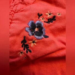 Infant girl overalls. 2- braided straps either 2- adjustable snaps. 4- pockets. Belt loops. 6- snap up bottom closure. 2- side snaps. On the left & right hip area is an embroidered flower. Soft cotton material. Very good, used condition.