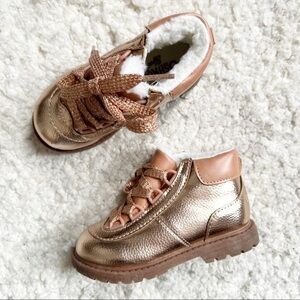 OSHKOSH: Rose Gold Faux Sherpa Lined Boots Sz 7 in EUC with an entire life to live. Adorable shimmering laces Very on trend and oh so cute for your little fashionista! Statement boots that can easily be paired with so much. Tie up closure. Rubber soles for great traction. Use zoom to see intricate details in photos and please ask questions prior to purchase. One tiny scuff on front of right boot- hard to see. Sold out FAST!
