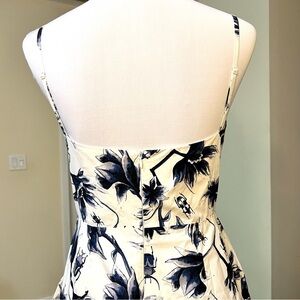 This OSMAN sundress features a striking asymmetrical high-low hemline in a beautiful blue and white color palette.