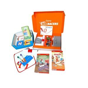 The OSMO Lot is a collection of educational electronic learning toys from the brand Osmo. This set includes various games such as Hot Wheels Mind Racers with cars, base and reflector, no tokens. Numbers, Words, Tangram, Coding, Dry Erase board with iPad base and reflector and 2 Markers and the two sealed games are Detective Agency and Pizza Co.