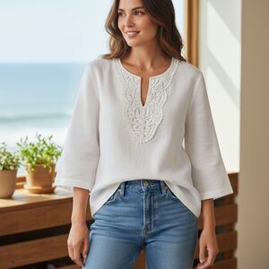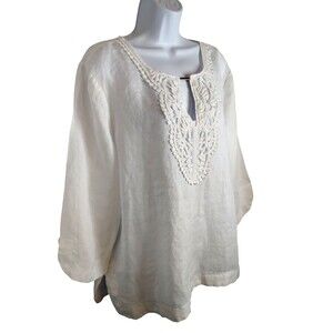 Introducing a stylish addition to your wardrobe - the OSO Casuals XLarge Tunic Top in White! This blouse features a round neckline and 3/4 sleeves, perfect for a casual occasion. The pullover closure and relaxed fit make it easy to wear, while the crochet accents add a touch of elegance. Made of linen, a machine-washable material, this blouse is easy to care for. The tunic style and white color make it versatile and suitable for any occasion. The brand, OSO Casuals, is known for its quality and style. Add this top to your collection today! Great condition. SMOKE FREE HOME