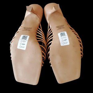 OSOS Design sandals features square-toe styling. Heel height three inches. Try-on only. Excellent condition. Imported. All manmade materials.