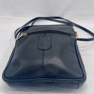 This Osprey vintage crossbody bag in black leather features a rectangle shape with a zip closure. It has a multicoloured fabric lining, black leather handle/strap, and gold hardware. The bag measures 7.5” in width, 8”in height, and 1.5” in depth. .