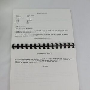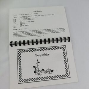 The book features recipes from group members, with the contributor's name. Chapters include: Appetizers; breads & muffins; breakfast; brownies & cookies; desserts; main dishes; pasta & rice; soups; salads and Miscellaneous. And in fact 2 of the most interesting "misc" recipes I've seen "dog biscuits" and "home brew".