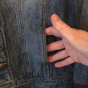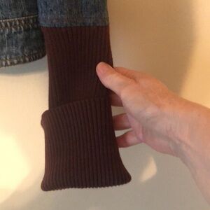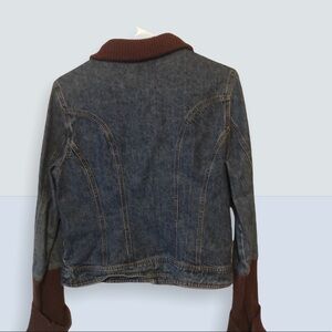 OTB, One Tough Babe denim jacket in large. Brown Sweater ribbing on collar and cuffs. Uniquely constructed seams . Metal button missing on top . Excellent condition .