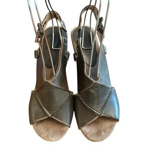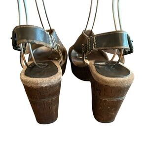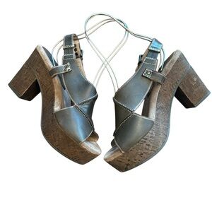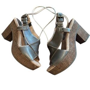 You will love these retro cork platform heels. Perfect for the Boho vibe, excellent for concerts and festivals with their microfiber covered cushioned footbed! They are so comfortable! Buckle closure with an elastic stretch for the perfect fit. 1” platform & 3.5” heel. I did glue the slingback after they were in a hot storage they might need to be done again. Not noticeable on.