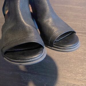 OTBT Metaphor black textured leather upper. Open toe with cut out. Adjustable ankle leather buckle strap. Chunky 3 inch heel in great condition size 7.5