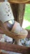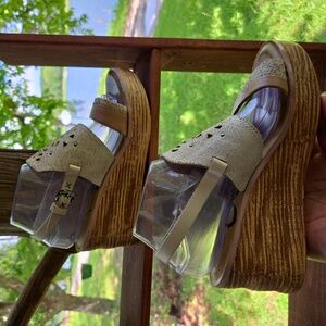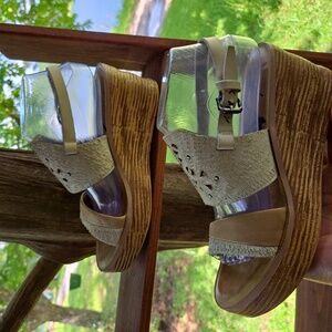 Off The Beaten Track beige leather strappy wedge sandal with boho cut out and silver studding at vamp. Buckle closure. Faux wood wedge. Size 8.5. Good pre-owned condition.