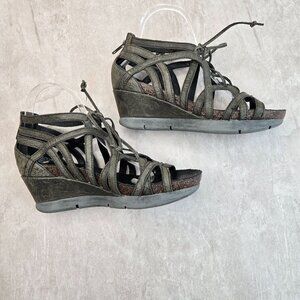 OTBT Lace Up Wedge Sandal Sz 8.5 Embossed Green Leather Open Toe Platform Wedges