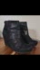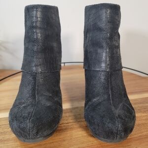 Contemporary chic black distressed oiled suede hidden wedge boots. Ankle Boots style with mock foldover top and crocodile pattern. Back zippers. Cushioned footbed.