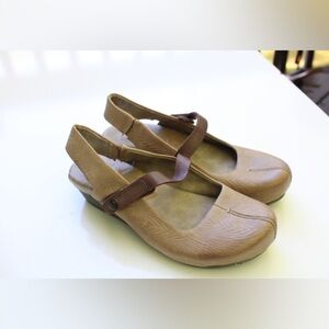 Leather upper. Light taupe. Asymmetrical Mary Jane ankle strap