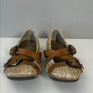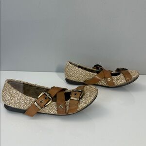 This is a ballet flat which is set in a nubuck leather upper with crisscrossing straps and buckle details for chic look and perfect fit