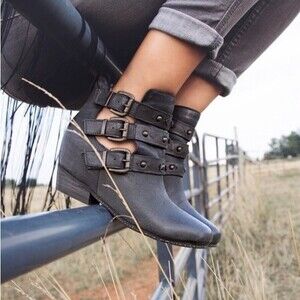 Step out in style with these edgy yet versatile OTBT wedge ankle boots. Crafted for comfort and character, these boots feature a sleek distressed black finish, triple buckle strap detailing, and a low wedge heel for all-day wear.