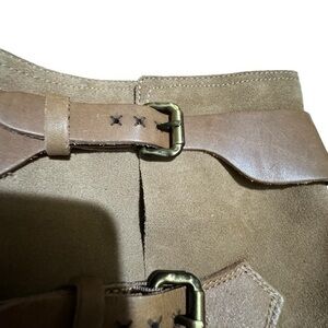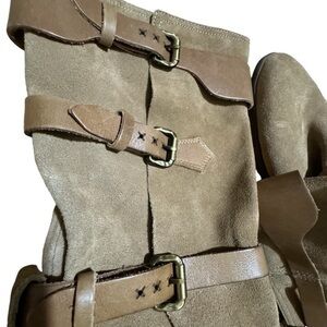 Taupe Suede/ Leather Upper Side Opening with Faux Leather Straps and Buckles and hidden approximately 2” heel. 4 buckle straps adorn these fabulous boots and open up to enable easy on-Slip on/ Almond toe/Comfort Tech/Lightweight