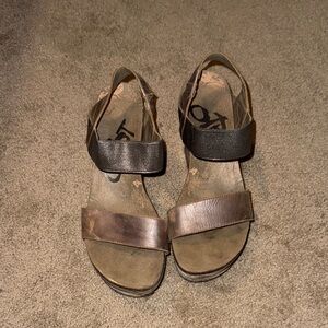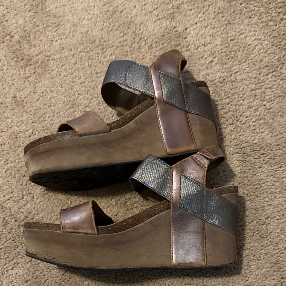 Elevate your style with these chic women's wedge sandals. Featuring a blend of brown and gray tones, these sandals are perfect for any occasion. Enjoy comfort and fashion in one stylish package. Used condition.