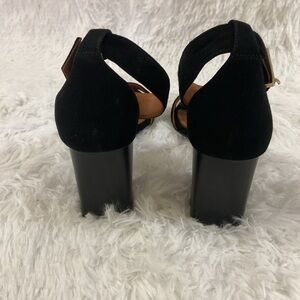 Color-black,Suede.Sandal has3 inches block heel and 10 1/2 inches ankle strap.