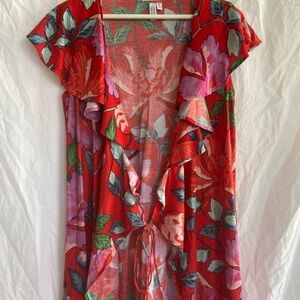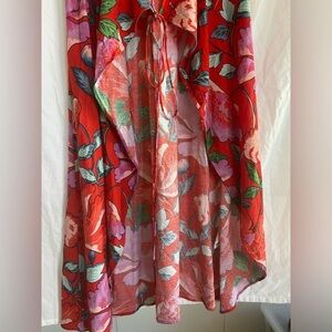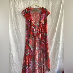 Sleeveless midi length wrap dress with a bright allover peony print, neckline ruffles and a delicate waist tie closure.