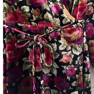 & Other Stories, featuring a dark floral velvet pattern. The dress has a V-neckline, a tie at the waist, and a mini-length hemline. The fabric appears to be a plush velvet with a rich, textured feel. The floral pattern consists of roses and other blossoms in shades of red, pink, and yellow against a black background