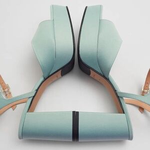Leather platform sandals featuring a chunky 90's block heel and a round toe, finished in smooth satin. Buckled ankle straps for a secure fit.