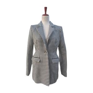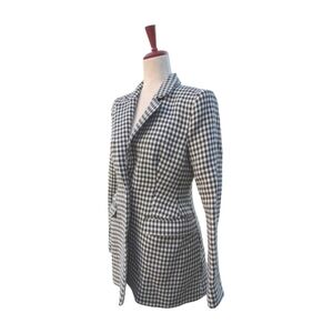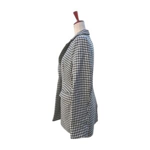 Fully lined, single-breasted, hip-length blazer with a gingham check fabric and princess seaming with a darted waist and features a notched lapel with single button front closure, two front welt pockets with flaps, interior chest pocket, padded shoulders, and back vent.