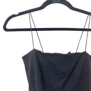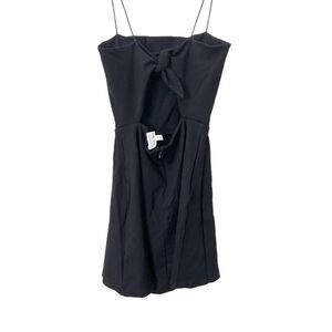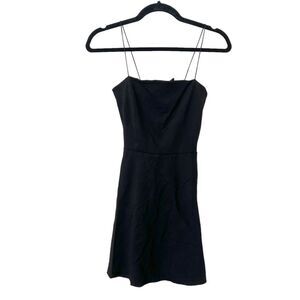 Black mini dress - skater style. Skinny spaghetti straps. Tie back with large opening. Zippered closure in back. Viscose, polyamide, elastane blend. Excellent preloved condition - size 2
