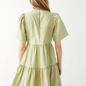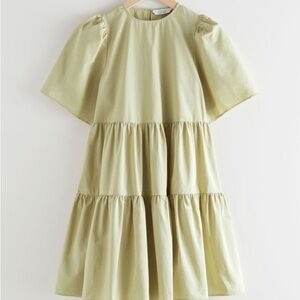 Khaki-colored mini dress with a soft light olive tone. Features a crewneck, voluminous sleeves, and a playful ruffled skirt. Lightweight and easy to style year-round. Gently worn, excellent condition.