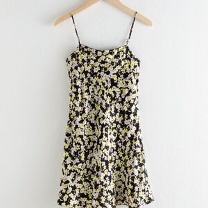 & other Stories women floral slip dress size US4 great condition. Easy slip dress with adjustable straps. yellow black florals. 100% Polyester with black slip underneath.