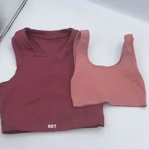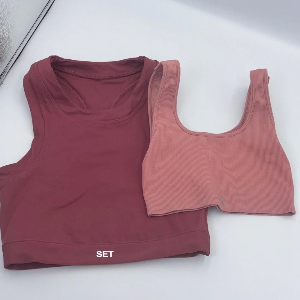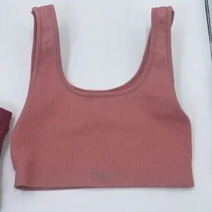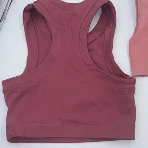 Ribbed top in a dusty rose color. Soft and chic design. Burgundy sports bra is a small the light pinkish one is a XS can split up. Excellent condition.