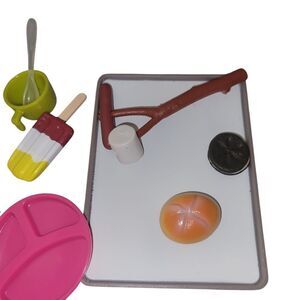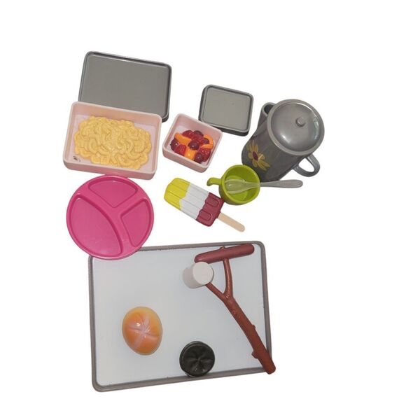 Fun and colorful toy kitchen set with various accessories. Includes pink, gray, and green items.