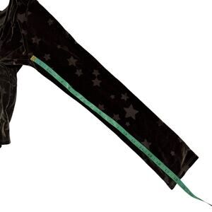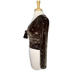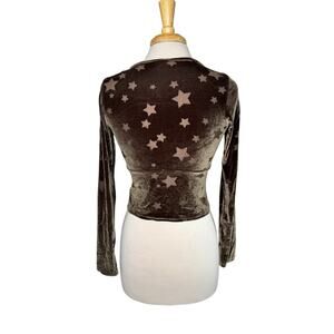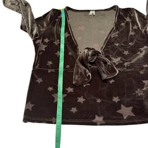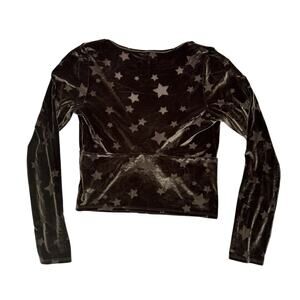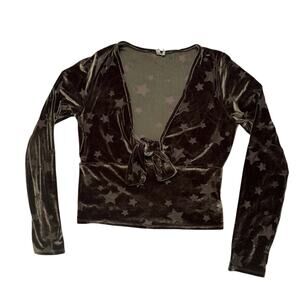 OUT FROM UNDER Urban Outfitters Green Stars Velvet Crop Tie-Front Top. Size Medium Womens. Long sleeve. Stars are sheer. Top is lightweight and perfect for layering over a cami. Dark moody green velvet appears silver in some light, olive in others. Polyester-nylon-spandex. Excellent condition — no rips, stains, or holes.