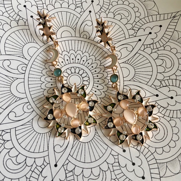 For the astrological enthusiast, these would be perfect! Sun and Moon dangle earrings with over a 3”drop. Lightweight and easy on the earlobes. It’s sister pair in the second photo is available in its own listing.