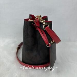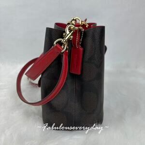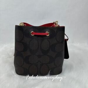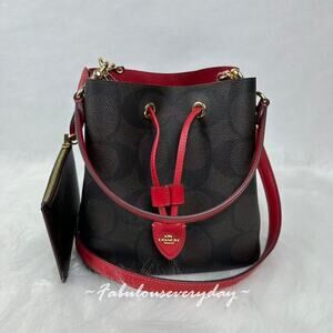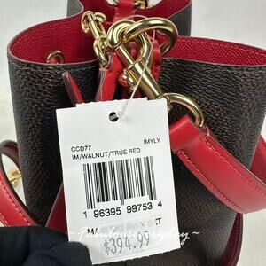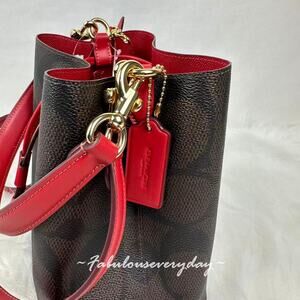 New With Tags, Coach Rowan Bucket Bag In Maxi Signature Canvas/Gold/Walnut/True Red CCD77 NWT from smoke and pet free environment.