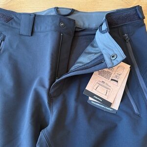 Mens size Medium, black, softshell, ski pant, zippered thigh vents, wind resistant, breathable, zip hand pockets, reinforced scuff guards, stretch mesh internal gaiter, snap zipper fly, articulated knees, ankle zippers, adjustable waist tabs, belt loops.