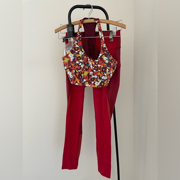 Super soft & buttery. Great condition. Size S. Racerback style sports bra with mesh and removable pads and 7/8 color block leggings highwaisted with elastic band. Great for yoga and pilates.