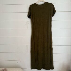 New with tags / NWT Outerknown Neptune Tee Dress Olive Green Hemp Blend Tagged Size Small Classic timeless elegant sustainable fabrics quiet luxury athleisure comfy dress athletic summer casual soft maxi dress side slit coastal cowgirl whimsy fairy goth minimal minimalist