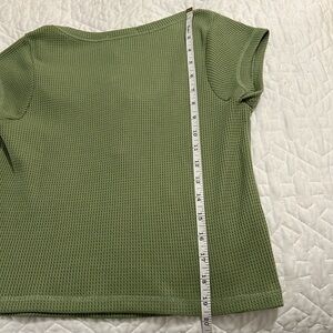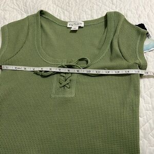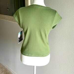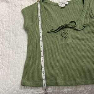 Green lace up front with tie crop top, cap sleeves, size medium. Stretchy comfortable and versatile. Wear with skirts, jeans, slacks or shorts. Great color. NWT