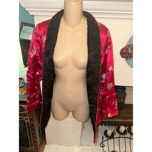 BEAUTIFUL VINTAGE CHINESE JACKET FROM FLYING SQUIRREL - RED PRINT REVERSES TO BLACK SOLID. SIZE M, MEASUREMENTS IN PHOTOS. EXCELLENT CONDITION.