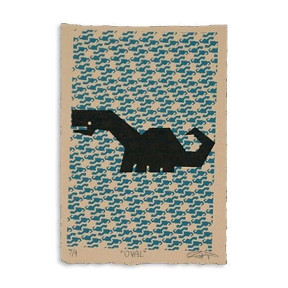 It has 2 hand-printed colors - black & navy; it is silk screened by hand on tan BFK Rives paper.