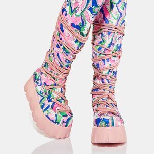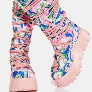 Over The Moon Platform Boots just touched down. These boots come in a quilted construction, with a jacquard print all over, a lace up closure front and back design, treaded platform soles, and faux fur trim detailing at the top.