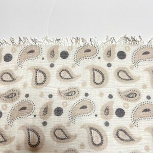 Lovely scarf is semi sheer in a woven fabric. No label or materials label. Beige, black and cream colors.