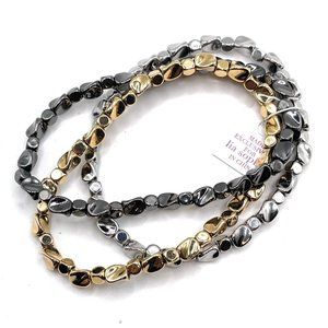 Mixed metals x3. This set of 3 stretch bracelets works with all other accessories and features beads in shades of hematite, matte gold and polished silver. Former display item in excellent condition.