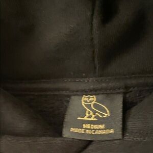 Stylish black sweater with bold red maple leaf design. Features OVO branding.