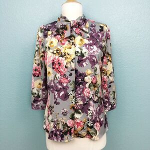 Gorgeous floral tie neck blouse by OVS. Button down is hidden. One button sleeve cuff. OVS is an Italian brand. Their sizing runs differently. It is marked a 44 which is equivalent to an 8/M. All measurements are approximate, taken flat and buttoned closed.