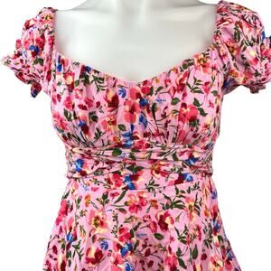 O.Vianca Pink Multicolor Floral Sweetheart Puff Sleeve Ruffle Romper Jumpsuit S