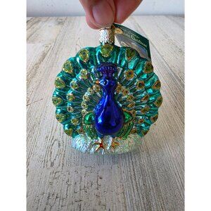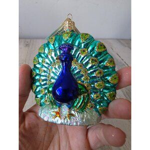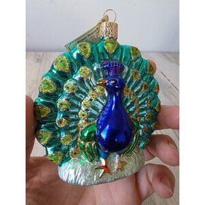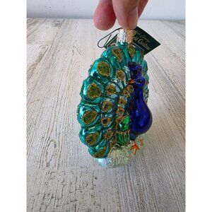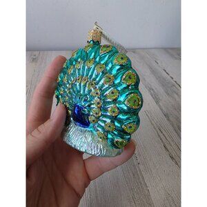 OWC old world proud peacock glitter bird ornament glass green purple Xmas tree